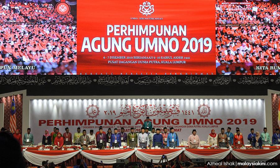 Pengunjung berjalan melepasi logo umno pada mesyuarat majlis tertinggi umno di menara dato' onn, pusat dagangan dunia putra (pwtc), kuala lumpur.